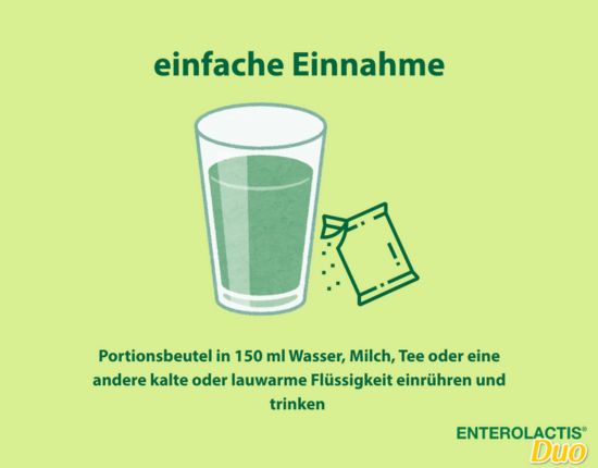 Am besten auf nüchternen Magen trinken. ENTEROLACTIS Duo kann täglich angewendet werden – auch während einer Antibiotika-Therapie oder in der Stillzeit.