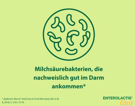 ENTEROLACTIS Duo ist die ideale Wahl für die nachhaltige Versorgung deiner Darmflora. Die Kombination aus L. casei DG® Milchsäurebakterien und dem Ballaststoff Inulin ergänzt eine gesunde Darmflora.